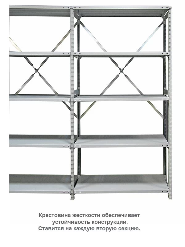 Стеллаж ТСУ монтируется без болтов, с помощью особых стяжек и крестовин жёсткости, что позволяет с лёгкостью собрать его без специальных инструментов. Уникальная конструкция придаёт изделию повышенную прочность и устойчивость.